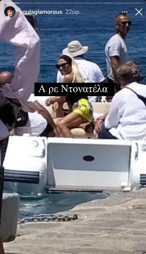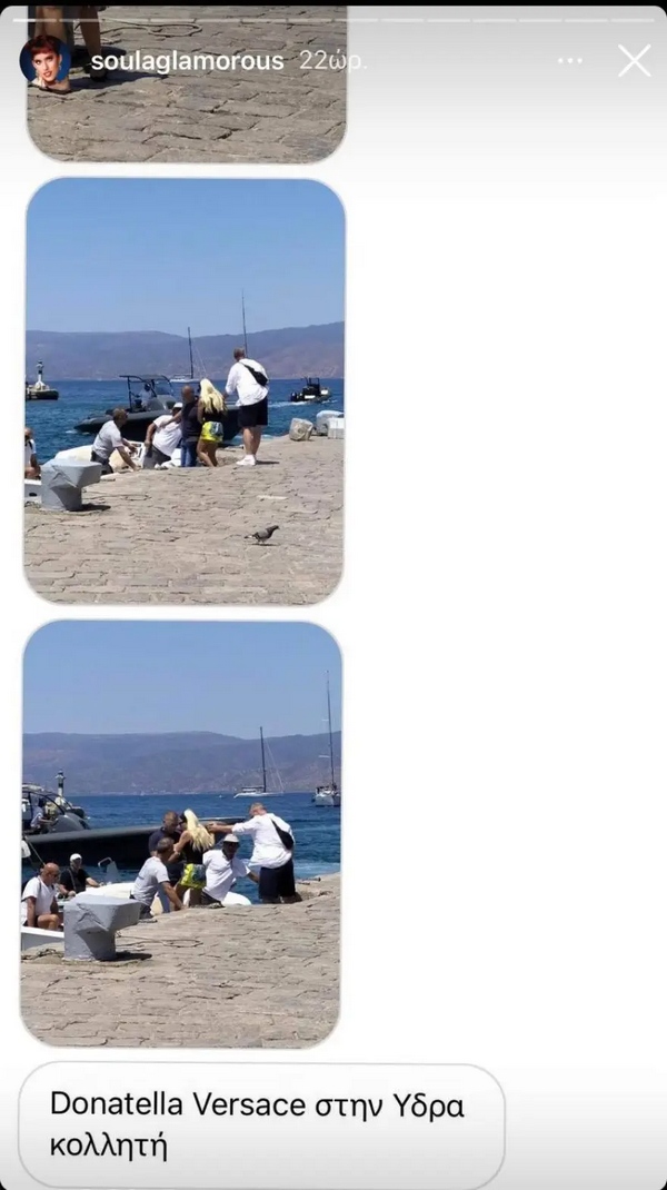 Η Ντονατέλα βρίσκεται στην Ύδρα και η Κλόντια Σίφερ στο Πόρτο Χέλι. Η σχεδιάστρια μόδας επιβιβάστηκε σε σκάφος και ήταν χαλαρά ντυμένη φορώντας φλοράλ κίτρινο σορτσάκι και μαύρο τοπ. Απαραίτητο αξεσουάρ η μαύρη κορδέλα στα μαλλιά της και γυαλιά ηλίου.