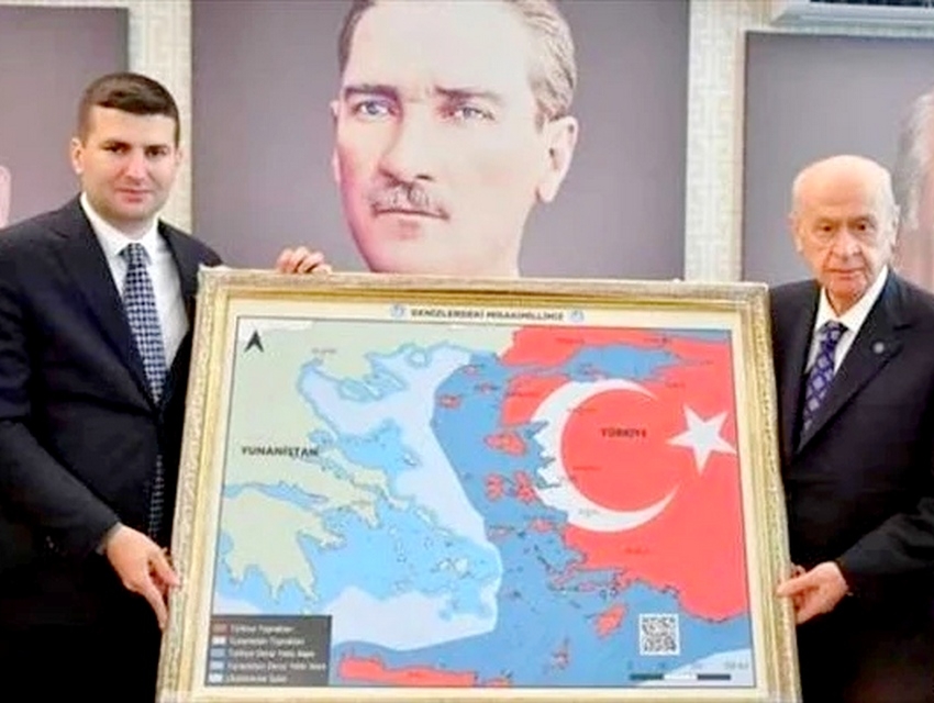 Όπως αναφέρθηκε, συνεχίζει την προκλητική ρητορική της η Τουρκία. Το νέο διπλωματικό ατόπημα έρχεται αυτήν τη φορά από τον ηγέτη των Γκρίζων Λύκων και πολιτικό εταίρο του προέδρου Ρετζέπ Ταγίπ Ερντογάν, Ντεβλέτ Μπαχτσελί που φωτογραφίστηκε στην έδρα της εθνικιστικής οργάνωσης με χάρτη, στον οποίο τα περισσότερα νησιά του Αιγαίου, καθώς και η Κρήτη, απεικονίζονται ως τουρκική επικράτεια.