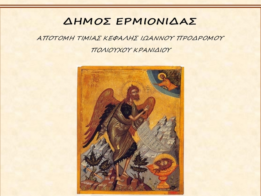 Ο Δήμαρχος Ερμιονίδας, η Πρόεδρος και τα μέλη του Δημοτικού Συμβουλίου, ο Πρόεδρος και τα μέλη του Συμβουλίου της Κοινότητας Κρανιδίου, σας προσκαλούν στον εορτασμό επί τη μνήμη της Αποτομής της Τιμίας Κεφαλής του Προφήτου και Βαπτιστού Ιωάννου Προδρόμου Προστάτου και Πολιούχου του Κρανιδίου στις 28 & 29 Αυγούστου 2022.