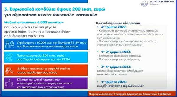 Από την πλευρά του ο υπουργός Περιβάλλοντος και Ενέργειας Κώστας Σκρέκας ανακοίνωσε δύο προγράμματα, το «Εξοικονομώ – Ανακαινίζω» για νέους ηλικίας 18-29 ετών και το «Ανακαινίζω-Ενοικιάζω» για ανακαίνιση παλιών κενών κατοικιών.