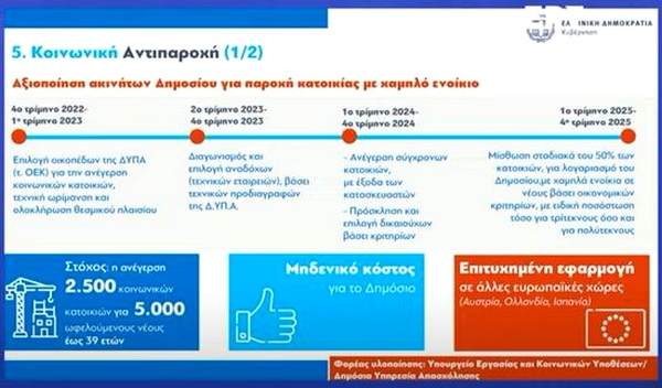 Πρώτον, αξιοποιούνται 2.500 ακίνητα της Δημόσιας Υπηρεσίας Απασχόλησης (πρώην ΟΑΕΔ) για την ανέγερση κοινωνικών κατοικιών.
