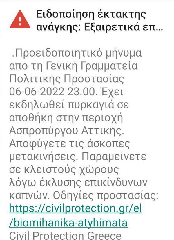 Συγκεκριμένα το προειδοποιητικό μήνυμα της γενικής γραμματείας Πολιτικής Προστασίας αναφέρει: «Έχει εκδηλωθεί πυρκαγιά σε αποθήκη στην περιοχή Ασπροπύργου Αττικής. Αποφύγετε άσκοπες μετακινήσεις. Παραμείνετε σε κλειστούς χώρους λόγω έκλυσης επικίνδυνων καπνών».