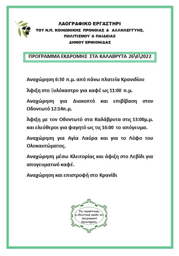 Το Λαογραφικό Εργαστήρι του Δήμου Ερμιονίδας διοργανώσει εκδρομή στα Καλάβρυτα την Κυριακή (26/06). Όποιος ή όποια θέλουν να κάνουν κράτηση, μπορούν να επικοινωνούν στα τηλέφωνα 6970957254 και 6947870627. Οι διαθέσιμες θέσεις είναι λίγες.