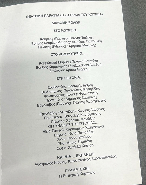 Είναι χαρακτηριστικό ότι το αμφιθέατρο στο Γυμνάσιο της περιοχής ήταν ασφυκτικά γεμάτο, ενώ υπήρξε και κόσμος που δεν μπόρεσε να μπει για να παρακολουθήσει το έργο. Μέσα από την ομαδική δουλειά, την αγάπη για το θέατρο και την πίστη για τη δουλειά, το αποτέλεσμα στο… σανίδι ήταν εξαιρετικό. Είναι χαρακτηριστικό ότι οι Γιάννης Τσιβίλης και Πελαγία Σαμπάνη που ενσάρκωσαν τους ρόλους του κουρέα και της κομμώτριας έχουν δημιουργήσει μια όμορφη οικογένεια, ενώ λειτουργούν μαζί κομμωτήριο!