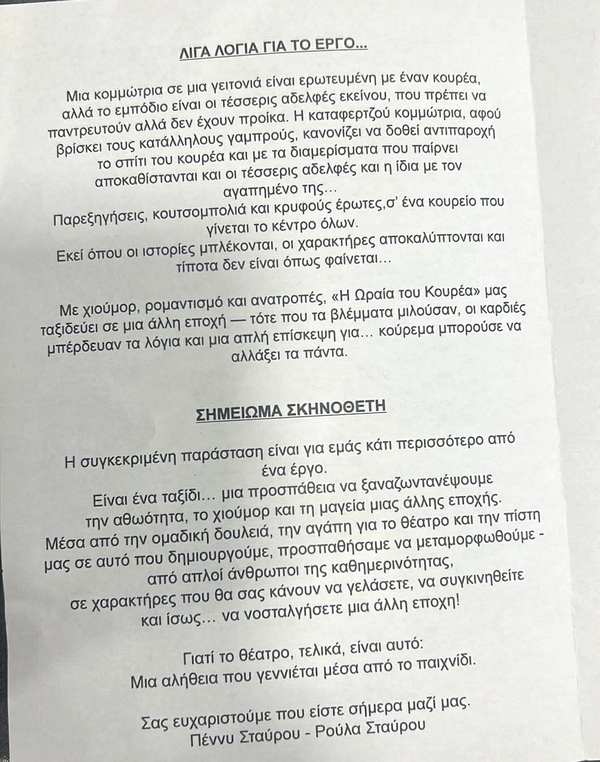«Η συγκεκριμένη παράσταση είναι για εμάς κάτι περισσότερο από ένα έργο. Είναι ένα… ταξίδι, μια προσπάθεια να ξαναζωντανέψουμε την αθωότητα, το χιούμορ και τη μαγεία μιας άλλης εποχής. Μέσα από την ομαδική δουλειά, την αγάπη για το θέατρο και την πίστη μας σ’ αυτό που δημιουργούμε, προσπαθήσαμε να μεταμορφωθούμε από απλοί άνθρωποι της καθημερινότητας σε χαρακτήρες που θα σας κάνουνε να γελάσετε, να συγκινηθείτε και ίσως να νοσταλγήσετε μια άλλη εποχή!