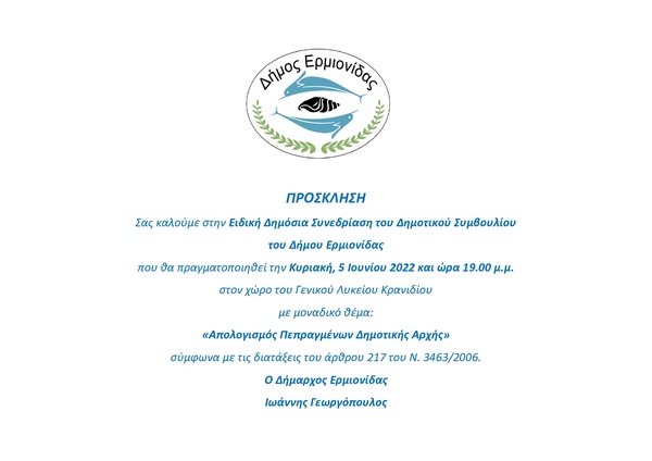 Σας καλούμε στην Ειδική Δημόσια Συνεδρίαση του Δημοτικού Συμβουλίου του Δήμου Ερμιονίδας που θα πραγματοποιηθεί την Κυριακή, 5 Ιουνίου 2022 και ώρα 19:00 στον χώρο του Γενικού Λυκείου Κρανιδίου με μοναδικό θέμα: