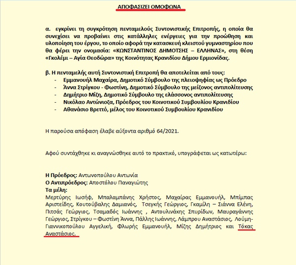 Θα του υπενθυμίσω ότι με την υπ’ αριθμ. 64/2021 ομόφωνη Απόφαση του Δημοτικού Συμβουλίου Ερμιονίδας ορίστηκε η ΔΙΑΠΑΡΑΤΑΞΙΑΚΗ πενταμελής Συντονιστική Επιτροπή “Κλειστό Γυμναστήριο Κωνσταντίνος Δημότσης ή Έλληνας” με Πρόεδρο τον Δημοτικό Σύμβουλο κ. Μαχαίρα Μανώλη και μέλη τους Δημοτικούς Συμβούλους κ.κ. Μίζη Δημήτριο και Στρίγκου – Φωστίνη Άννα, τον Πρόεδρο του Συμβουλίου Κοινότητας Κρανιδίου κ. Αντώνιοζα Νικόλαο και τον Κοινοτικό Σύμβουλο Κρανιδίου κ. Βρεττό Αθανάσιο.