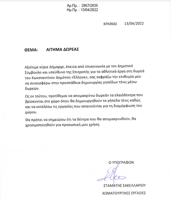 Τις εργασίες αυτές οποίες αιτήθηκε να τις κάνει δωρεάν ο κ. Σακελλαρίου Σταμάτης με το υπ’ αριθμ. 2867/2835/13-04-2022 έγγραφό του προς την Συντονιστική Επιτροπή.