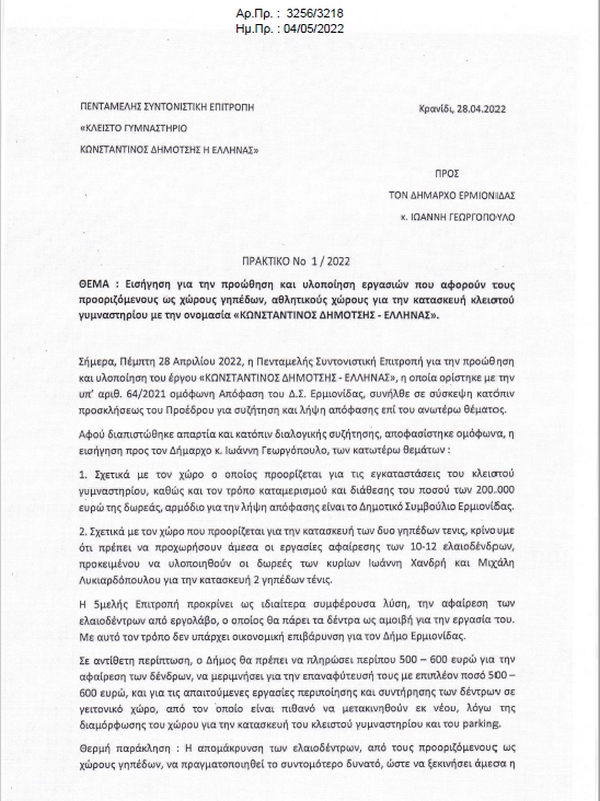 ζ) Ο ισχυρισμός του Δημάρχου Ερμιονίδας ότι δεν θέλω, εγώ προσωπικά, να γίνει κανένα έργο, δεν συνάδει με την σχεδόν 30χρονη ενασχόλησή μου στα αθλητικά δρώμενα και της προσπάθειας που κάνουμε για την κατασκευή Κλειστού Γυμναστηρίου, ένα έργο πνοής για τον Αθλητισμό της ευρύτερης περιοχής.