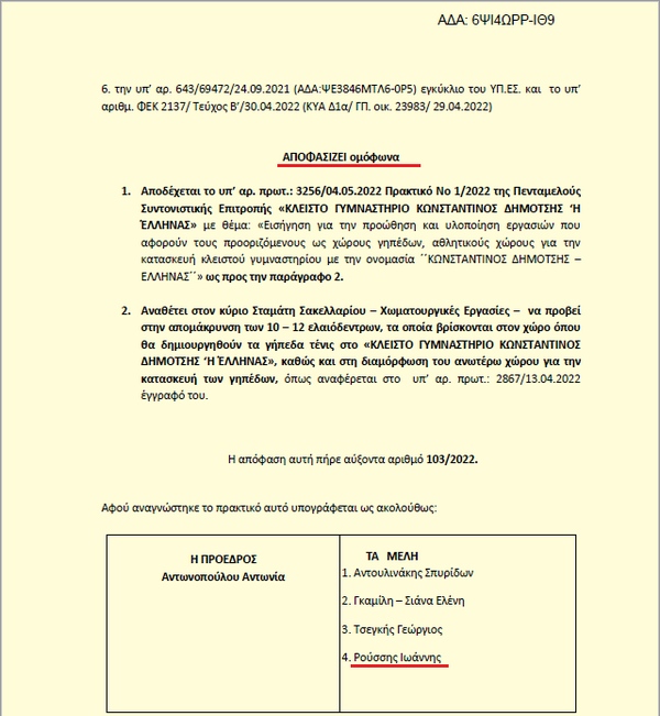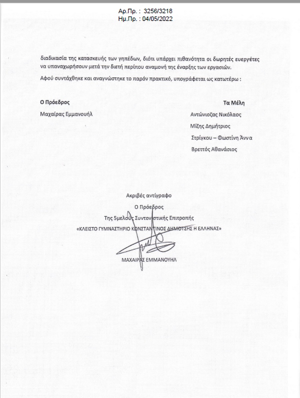 Επισημαίνοντας ότι η συγκεκριμένη Επιτροπή «είχε αποκλειστική αρμοδιότητα και μόνο να προβεί στις κατάλληλες ενέργειες για την προώθηση της κατασκευής Κλειστού Γυμναστηρίου που θα φέρει την ονομασία του δωρητή».