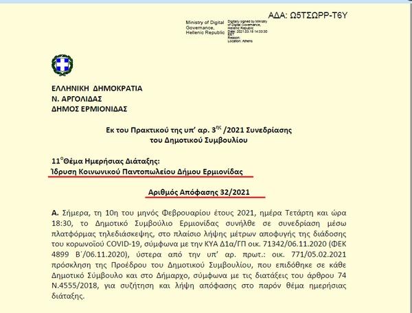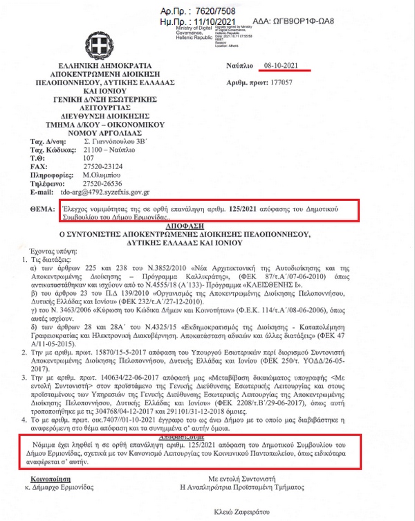 Το τρίτο βήμα ήταν η παραπάνω Απόφαση να λάβει νομιμότητα από τις αρμόδιες υπηρεσίες της Αποκεντρωμένης Διοίκησης Πελοποννήσου, Δυτικής Ελλάδας & Ιονίου, κάτι που συνέβη με την υπ’ αριθ. πρωτ. 177057/08-10-2021 Απόφαση, η οποία πρωτοκολλήθηκε στο Δήμο Ερμιονίδας στις 11/10/2021: