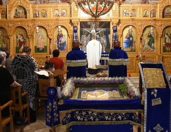 Ειδικότερα, τις Ιερές ακολουθίες τέλεσε ο εφημέριος του ναού π. Βασίλειος Γκολέμης. Όπως αναφέρθηκε χαρακτηριστικής ακουστικής μελωδίας ήταν τα εγκώμια προς την Υπεραγία Θεοτόκο που ψάλλονται με επτανησιακό χρώμα, από τους ψάλτες του ναού.