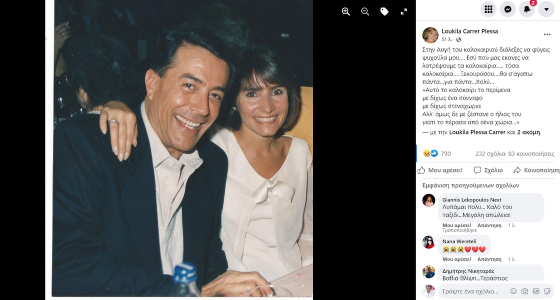 «Στην Αυγή του καλοκαιριού διάλεξες να φύγεις ψυχούλα μου. Εσύ που μας έκανες να λατρέψουμε τα καλοκαίρια, τόσα καλοκαίρια. Ξεκουράσου, θα σ’αγαπω πάντα… Αυτό το καλοκαίρι το περίμενα με δίχως ένα σύννεφο, με δίχως στεναχώρια… Αλλ’ όμως δε με ζέστανε ο ήλιος του», σημείωσε στην ανάρτησή της.
