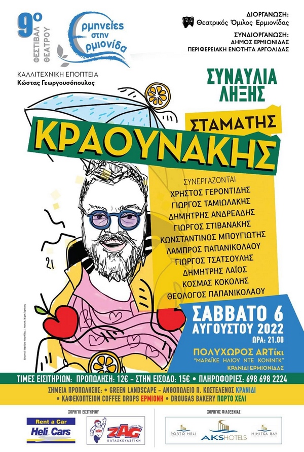 Με μια μοναδική συναυλία και με καλεσμένο τον Σταμάτη Κραουνάκη θα ολοκληρωθεί το 9ο Φεστιβάλ Θεάτρου «Ερμηνείες στην Ερμιονίδα» (θα ακολουθήσουν μεταφεστιβαλικές εκδηλώσεις) το Σάββατο 6 Αυγούστου!