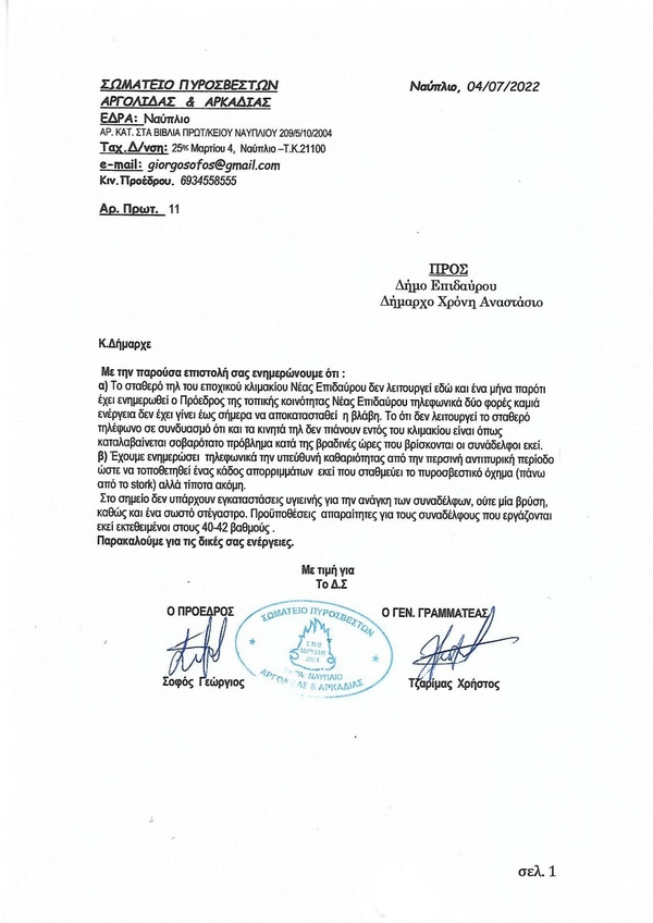 α) Το σταθερό τηλ του εποχικού κλιμακίου Νέας Επιδαύρου δεν λειτουργεί εδώ και ένα μήνα παρότι έχει ενημερωθεί ο Πρόεδρος της τοπικής κοινότητας Νέας Επιδαύρου τηλεφωνικά δύο φορές καμιά ενέργεια δεν έχει γίνει έως σήμερα να αποκατασταθεί η βλάβη.