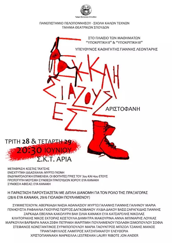 Οι φοιτητές θα παρουσιάσουν τις «Εκκλησιάζουσες» του Αριστοφάνη στον εξωτερικό χώρο του κτηρίου της Άριας στο πλαίσιο των μαθημάτων ΥΠΟΚΡΙΤΙΚΗ ΙΙ και ΥΠΟΚΡΙΤΙΚΗ ΙΙΙ (υπεύθυνος καθηγητής: Γιάννης Λεοντάρης – υπεύθυνη ενισχυτικής διδασκαλίας: Μυρτώ Γκόνη / μεταπτυχιακή φοιτήτρια ΤΘΣ).