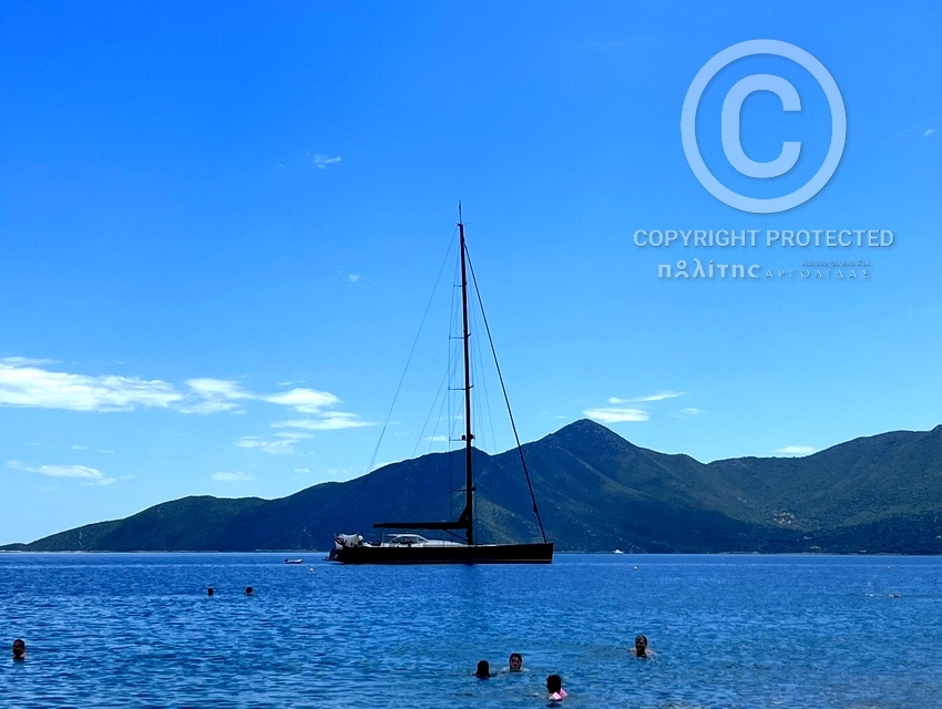 Το σκάφος… μάγεψε το «μαγευτικό» Λεωνίδιο. Εντυπωσιασμένοι οι λουόμενοι κοιτούσαν το επιβλητικό ιστιοφόρο να περνά μόλις λίγα μέτρα από την Παραλία της Πλάκας.